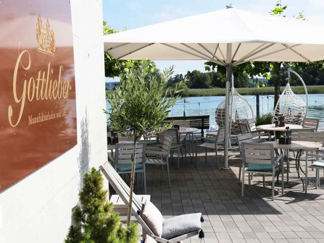 Im Gottlieber Seecafé mit Manufakturladen können sämtliche Gottlieber Spezialitäten wie Hüppen, Cacaomandeln und Schokolade eingekauft werden. Gemütliche Momente erleben die Besucher in schönem Ambiente auf der wunderschönen Seeterrasse bei einem kühlen Bier, Champagner oder einem guten Glas Wein. Aber auch an nebligen Herbst- und Wintertagen können Gäste die Seele baumeln lassen und das fliessende Wasser des Seerheins bei einer heissen und duftenden Tasse Kaffee beobachten.